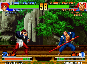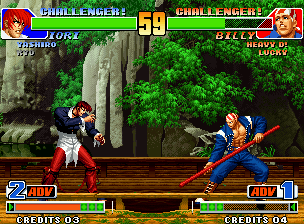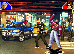 ほぼ負けが確定しているラウンドでも、うまく時間を稼いで相手の体力回復を妨げてやろう。ちなみに、以前当コンテンツにて「残り0〜9で倒す場合とタイムオーバーで勝つ場合とでは大きく回復量が異なる」と掲載していたが、誤りであることが発覚した。本作は2002と同様に、残りタイムが0〜9のときに倒した場合と、タイムオーバーで決着がついた場合とでは、回復量は同じなのである。この体力回復量の違いは、数年前に家庭用のネオジオROMにて手作業(この技を5回当ててからこの残りタイムで相手を倒すと、ここまで回復して・・・という感じの作業をテレビモニターにて行っていた)で調べた結果をもとにアップしたものであったため、ダメージのランダム性が考慮に入れられていなかった、ということが今回の誤りの直接の原因である。ここで深くお詫び申し上げたい。 ■試合終了後のゲージ溜め 相手を倒した後にも、一部の(主に多段ヒットの)必殺技ならば既にKOされている相手に当てることができる。なんと、この時ヒットした必殺技の分も、ゲージが溜まるようになっている。例えば、葵花の2段目で相手を倒した際、早めに3発目を入力しておくと、KO後に3発目が出てKOされた相手に3発目が当たる。このような場合でも、葵花の3発目の分のゲージがしっかり蓄積されているぞ。しかし、相手のゲージにもダメージを受けた際に溜まる分はしっかり蓄積されるので、下手に多段技でフィニッシュすると、逆に相手のゲージを多くしてしまうこともある。 ■キャンセル版特殊技をいきなり出す 通常、キャンセル版特殊技を出すには通常技からキャンセルで特殊技を出すしかない。だが、超必殺技を出せない状態で、キャンセル可能な通常技に超必殺技でキャンセルをかけようとすると、一見すると何もキャンセルしなかったように見えるものの、実は「仕込み」が完了している状態となる。「仕込み」が完了していると、なんと、キャンセル版の特殊技をいきなり出すことが可能となるぞ。ただし、通常技を当てたり、特殊技・必殺技・超必殺技を出したり、相手の攻撃をくらったりガードしたりしても「仕込み」は解除されてしまう。ちなみに、超必殺技のコマンドが他の必殺技のコマンドと重複していても、入力が正確ならば他の必殺技が暴発することはない。97からNWまでの作品(2003除く)で可能なネタだ。とはいえ、見た目が面白いだけで、特に有効な使い道はなさそうである・・・。 ■EXTモードでのMAX発動状態持続時間 EXTモードでは、自力で溜め切った場合と、相手の攻撃をガードもしくはくらうことで溜め切った場合とではMAX発動状態持続時間が異なる。具体的に言えば、相手の攻撃によってゲージを満タンにした場合のほうが、自力で溜め切るよりもMAX発動状態持続時間が長いのである。前者は約1900フレーム、後者は約1000フレームという長さになっている。そのため、状況によっては、ギリギリのところまで自力でパワーを溜めて、敢えて相手の攻撃によってゲージを満タンにするほうが良いということもあり得るぞ。 ■ガード持続 一般に「屈伸」だとか「ラオウガード」と呼ばれるもの。一度ガードポーズを取ったあとに、素早くしゃがみガード方向と立ちガード方向へ交互に入力を繰り返せば、ガードポーズを持続させることができる。こうすると、投げに対して無敵となることができるが、立ちガードとしゃがみガードを繰り返すのであるから、下段攻撃に対しては無防備となる。当て投げを回避して反撃する際には有効だが、読まれると下段技から連続技をもらいかねないので、注意が必要だ。 ■ノックバック このゲームにおいては、画面中央で地上技を相手に当てた場合は相手が後退し、端に追いつめた状態で地上技を相手に当てると逆に自分が後退するという仕様になっている。しかし空中技の場合、画面中央では地上技と同様だが、端では互いに後退しない。(なお、技を当てた直後に着地=つまり低い打点で技を当ててしまうと、着地後に若干のノックバックがかかる) そのため、「MAX発動中ならばノックバックが大きくなって反撃を受けづらい」技の代表格である龍連牙・地龍とタクマの強飛燕疾風脚も、端の相手にガードされてしまうと深くめり込んで簡単に反撃を受けてしまう。小ネタとして、端から数ドット離れた相手に地上技を当てると、相手が受けるノックバックがその数ドット分のみとなるので、普段では不可能な連続技が可能だ。例を挙げると、クラークでは近距離立ちC→前B→ウルトラアルゼンチンバックブリーカー、裏社ならば近距離立ちC→前A→にらぐだいちなど。 ■しゃがみ属性ダウン 通常、ジャンプの低いキャラではダウン中の相手を小中ジャンプで跳び越すことはできないと思われているが、しゃがみ状態からダウンした場合はダウン中のぶつかり判定(の大きさ・形)がしゃがみ状態と同一のものとなるため、小中ジャンプで跳び越すことができる。こうしたダウンの