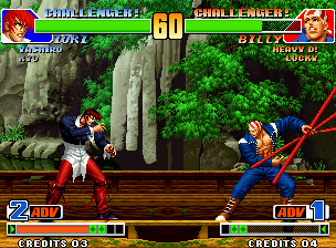 KOF98というゲームを深くやり込む上で理解が必要になるシステムの解析です。 ややネタ的なものが多いです。 ここに掲載されているシステムは以下のとおり。クリックするとそこまでジャンプすることができます。 これからどんどん追加していく予定です。掲載順は、内容が出揃い次第、五十音順にしていきます。 ■空中ガードによる硬直の軽減 通常、ガードには相手の技に応じたガード硬直がある。空中ガードも例外ではない。しかし、空中ガード硬直は着地とともに解除されるのだ。つまり低空で相手の技をガードできればガード硬直を大幅に軽減できる。カプエス2でチキンガードと呼ばれているテクニックと同様のものだ。これにより、対クリス戦などでは、クリスのジャンプふっとばしを低空で空中ガードした後に、確定反撃を入れることも可能。 ■体力回復量 このゲームでは、相手を倒した際の残りタイムにより、次ラウンドに向けての体力の回復量が決定される。残りタイムが多いほど回復量は増加するようになっているぞ。回復量と、その区切りは以下の表の通り。