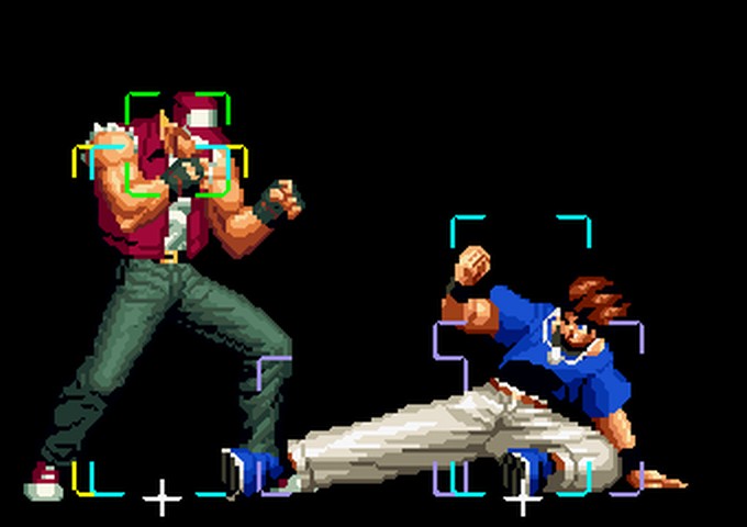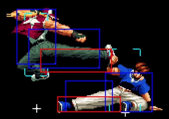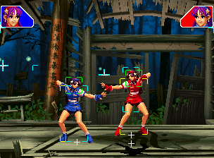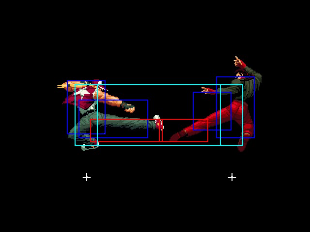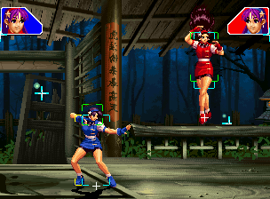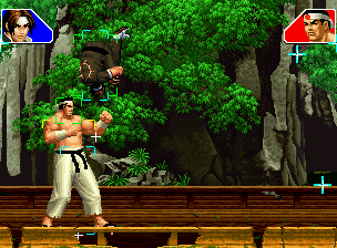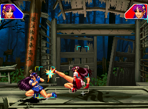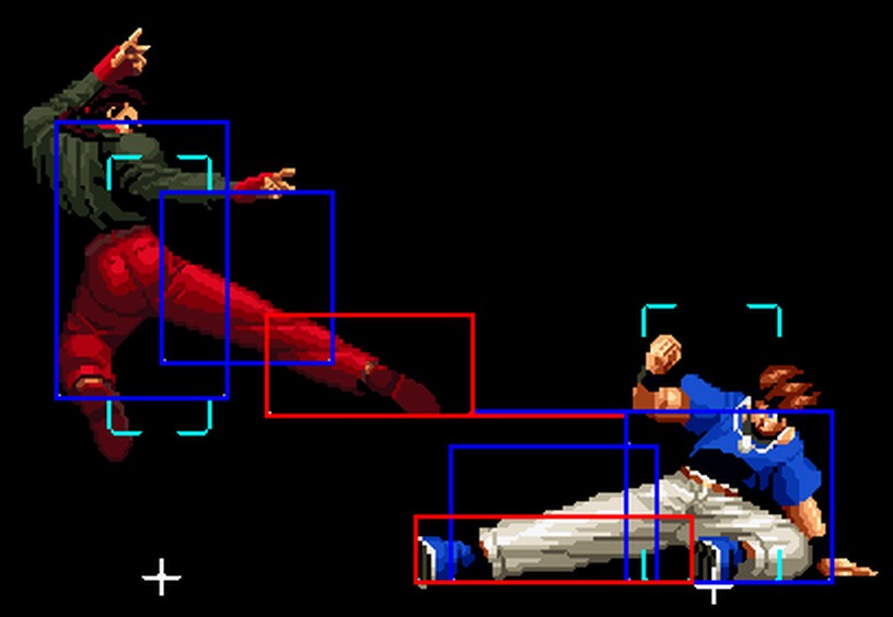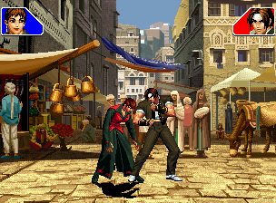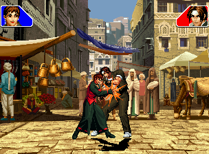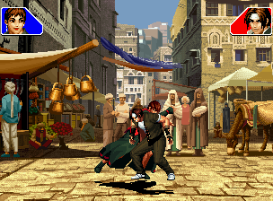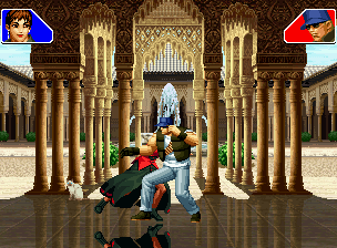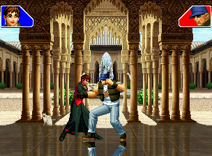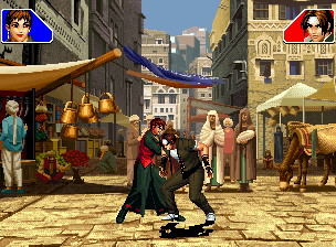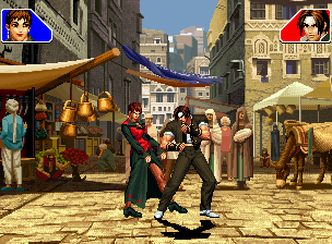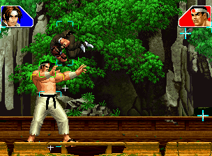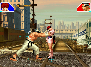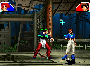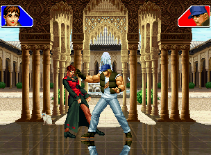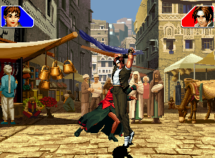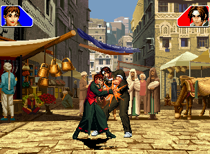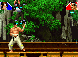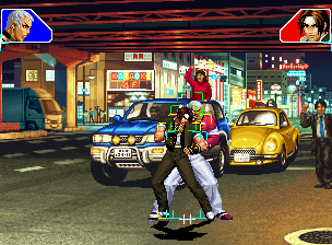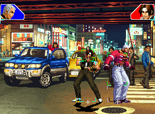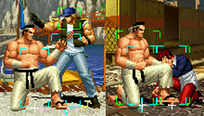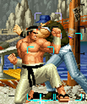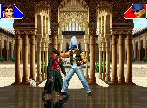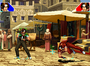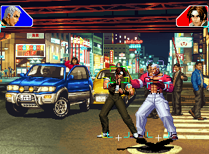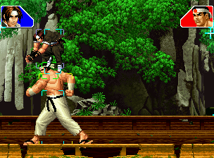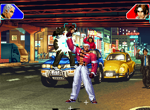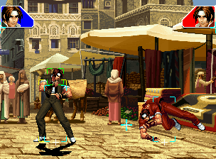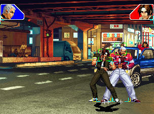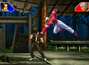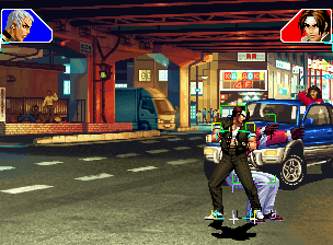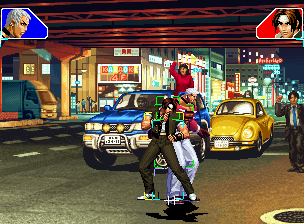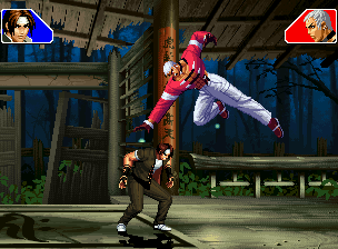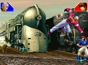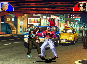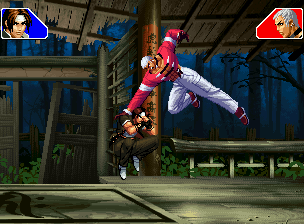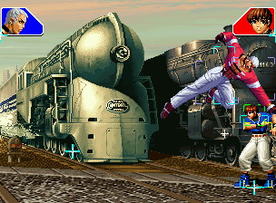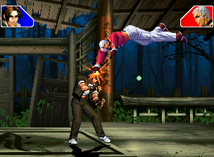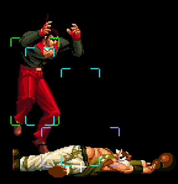 なお、GCCDに対しても打点の調整次第で無敵時間を利用しスカすことができる。 ■地震バグ 96以降のKOFシリーズは、起き上がりに、やられ判定が発生する前(行動可能になる前)に必ず立ち状態を経由する。実はこのとき、大門の弱地雷震の地震判定が重なると、連続技として確定で弱地雷震をくらってしまうのだ。これを「地震バグ」や「地雷バグ」、「地雷震バグ」、「確定地震バグ」などと呼ぶ。 イメージを助けるためにこちらに画像を用意した。参照してほしい。 【訂正】起き上がってやられ判定が発生する前(行動可能になる前)は、強制準立ちモーションではなく、単に「強制的に立ち状態にされている」だけである。画像に埋め込んだテキストであるために訂正が難しいため、この場で訂正させていただくことを深くお詫びしたい。 なお、ダウン回避をされた場合には立ち状態を経由しないため、地震バグを決めることはできない。 弱地雷震を確定させる上での弱地雷震の出し方は相手キャラによって異なるが、様々な行動をリバーサルで出し、タイミングを取りつつ安定して弱地雷震を確定させるレシピが現在ではほぼ完成している。キャラ別レシピ一覧ver.β(2007年7月30日更新)はこちら。地震バグレシピ別キャラ一覧ver.β(2007年7月30日更新)についてはこちら。GCCDを地上ヒットさせたあとに相手がダウン回避をしなかった場合のレシピはこちら。 なお、この地雷震バグについては一応の回避方法があり、詳細についてはこちらを参照してほしい。 ■浮遊 三角飛びができるキャラ(アテナ/舞/チョイ)と、シェルミー、マリーの5キャラは、地面より少し浮いた状態、つまり浮遊した状態のまま戦うことができる。 ![]() 右のアテナが少し浮いているのがお分かりだろうか? 例:アテナ 画面端まで下がってから後転し、その硬直中に412369Aで 三角飛びをした瞬間にスーパーサイキックスルーを出しながら浮遊 なお、後転やバックステップを挟んでいるのは、必殺技・超必殺技のコマンドの中に前方向が入っていた場合に、画面端から離れて三角飛びができなくなってしまうことを防ぐ目的から、硬直中に前方向の入力ができるようにするためである。もしコマンドの中に前方向が入っていなければ(アテナのサイコボールなど)、後転やバックステップは省いてしまってもかまわないし、前方向が入っていても、硬直のある行動ならばどんなものでも代用できる。特殊技で浮く場合には、単純に最低空の三角飛びの瞬間に特殊技を出すだけでかまわない。また、必ずしも自分が画面端を背負っている必要はなく、逆に相手を画面端に追いつめている状態でも、相手と縦軸を重ねることができれば画面中央側に向かって最低空の三角飛びができるので、浮遊することが可能だ。(前転を用いるか、相手が空中に居る状態でその下に潜り込む=端に行くことで相手と縦軸を重ねることができる) これは後述の永久を決める上では重要な点だろう。なお、特殊技・必殺技・超必殺技の中で、空中判定になるものは、三角飛びから浮遊するために使用することができない。せっかく浮遊しても、特殊技・必殺技・超必殺技自体が技後に着地してしまう性質であるため、すぐに浮遊状態が解除されてしまうのである。 それでは、三角飛びを用いない、特定の技を特定の状況で決めて浮遊する方法について説明しよう。このやり方で浮遊することができるのは、シェルミーとマリーの2キャラのみである。シェルミーは、ノーマル版のシェルミーフラッシュ(ノーマル・MAX問わず)を大門・ロバートのいずれかに決めればそのまま自動的に浮遊状態となる。マリーは、ダイナマイトスウィング(ノーマル・MAX問わず)を空中の相手にカス当たりさせたあと、ダウンした相手には投げられ判定が残っているので、そこに通常投げもしくはバックドロップリアルを決めることによって浮遊状態となることができる。相手がダウン回避をした場合は投げることができないので、浮遊することはできない。うまくバウンドした瞬間の相手を投げなければならないので、狙って浮遊することは難しいぞ。 浮遊状態では、ノーマルジャンプに準じた属性が各行動に付加されており、どの通常技にも中段属性が付き、自キャラにかかるヒットバックがなくなる。そして、強攻撃ののけぞりは弱攻撃のものと同じになり(つまり当てても反撃される強攻撃だらけになる)、出せる特殊技・必殺技・超必殺技は空中技のみとなる。ほとんど意味はないが、地上通常技キャンセルから空中必殺技を出して連続技、なんて芸当も可能だ。なお、通常投げは地上に居るときと同じように出すことができる。 中段属性が付くことによってもともと下段であった「一部の」技はガード不能となり、自キャラへのヒットバックがなくなることによって相手を端に追いつめた状態で弱攻撃を連打すれば永久になるぞ。また、空中に居る扱いになっているにもかかわらず、なぜか空中投げもくらわないよう