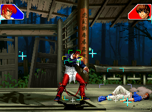 ■簡略コマンド 97の反省からか、本作では技のコマンドをしっかりと入力しないと技が出ないようになっている。しかし、それでも簡略コマンドは存在する。実戦でお世話になるものとしては以下のものがある。 2363214 →素早く2362364 21416 →246 前者は失敗時に暴発する技が通常技となるため、リスクを抑えられる。タクマやマチュア、ちづる使いにとっては重要だろう。後者は主に覇気キャンでお世話になる。 ■ ダウン回避詳細 ダウン回避は行動可能になった瞬間から投げられ判定があるとされるが、それを検証してみた。以下の画像は、クリスのダウン回避に裏社のくじくだいちを合わせているという場面を撮影したものである。 画像が小さいので分かりづらいが、6の画像から、クリスはやられ判定が出て行動可能になっている。ここでどのタイミングで上方向に入れればくじくだいちを避けることができるのか、まとめておこう。 2 3 4![]() 5 6 7 8![]() ・5〜8のフレームから上に入れる → つかまれる ・4のフレームから上に入れる → 下の画像9〜12のような塩梅でつかまれる ・3のフレームから上に入れる → 回避 なお、この状態で出されたくじくだいちには非常に反撃がしづらい (ノーマル・大ジャンプで避けてもコンボがほとんど入らない)。 そのため、どのような入力ならば小ジャンプが出るのかも以下にまとめておく。 ・1フレーム間上へ入れる → つかまれる ・2〜5フレーム間上へ入れる → 小ジャンプで回避 ・6フレーム以上の間上へ入れる → ノーマルジャンプで回避(ジャンプ攻撃のみでの反撃がやっと) 10 11 12![]() 以上から分かるように、ダウン回避直後には投げられ判定が発生している。行動可能になる前から上に入れておかなければならないのは、投げの成立はいつ?で触れたように、フラグが関係している(ダウン回避しているのだから、ダウン回避側が予め相手から攻撃を受けているはずである)からであろう。やはりというかなんというか、ダウン回避している相手を投げるというのは有効な攻めであるといえるだろう。 次に、ダウン回避中のぶつかり判定の大きさについて。要するに、ダウン回避中もしゃがみ属性ダウンとなっているかどうか、である。